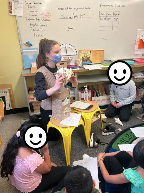 A Grade 4/5 classroom welcomed a new classroom pet named: “Mount Mushmore” — a blue oyster mushroom kit! Students tracked mycelium growth and discovered that food systems exist even in winter classrooms.