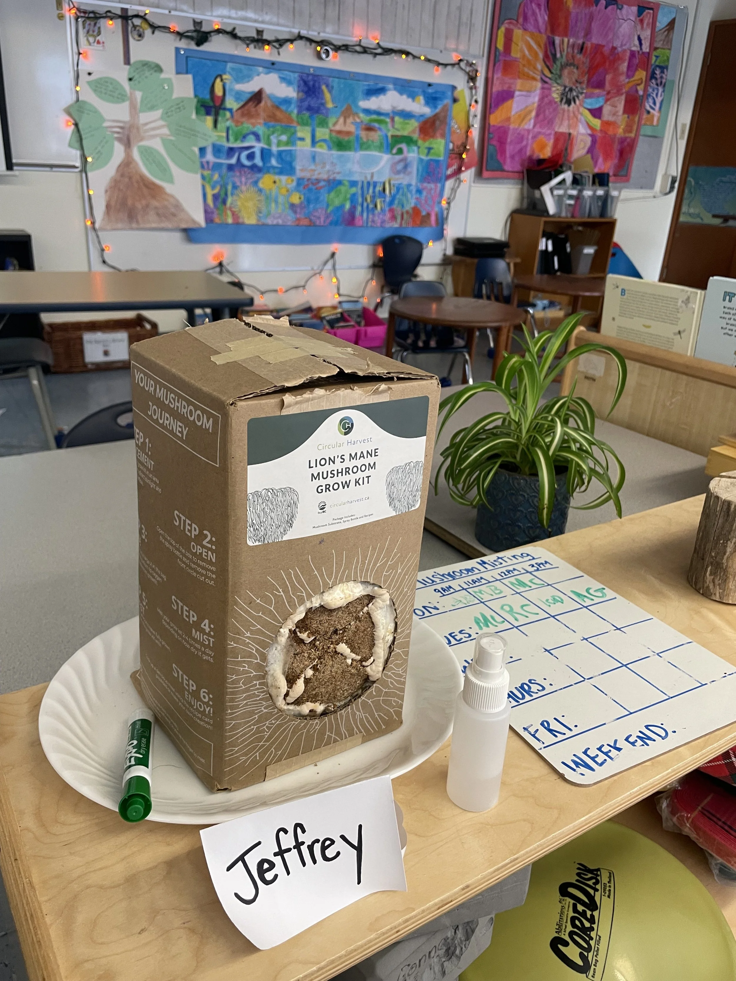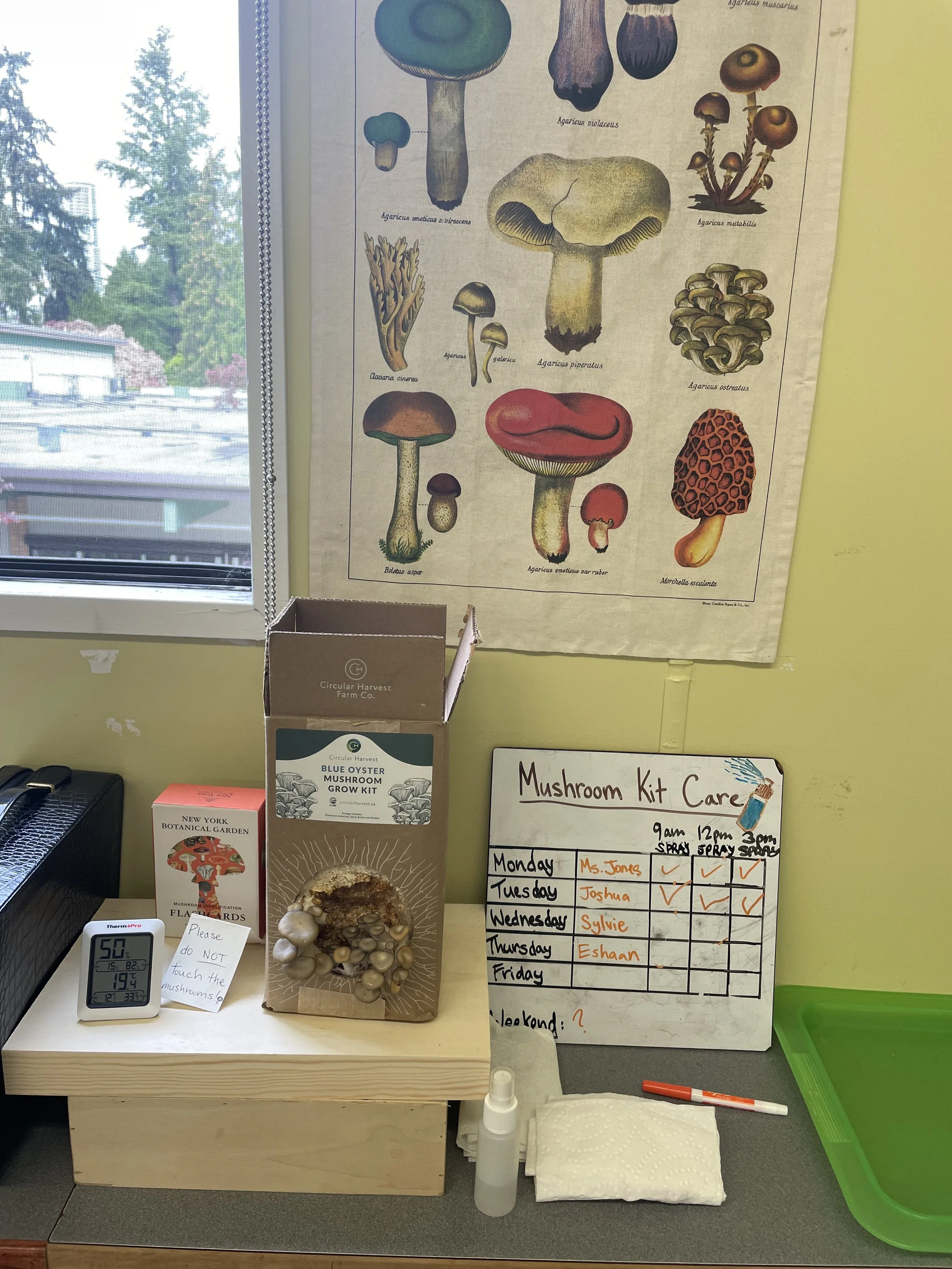 Caring for mushrooms is easy! Just mist them a few times a day and keep them near a window. They don’t need much room — a small table or shelf works perfectly. Don’t forget to pick a weekend “mushroom sitter” to keep them happy!